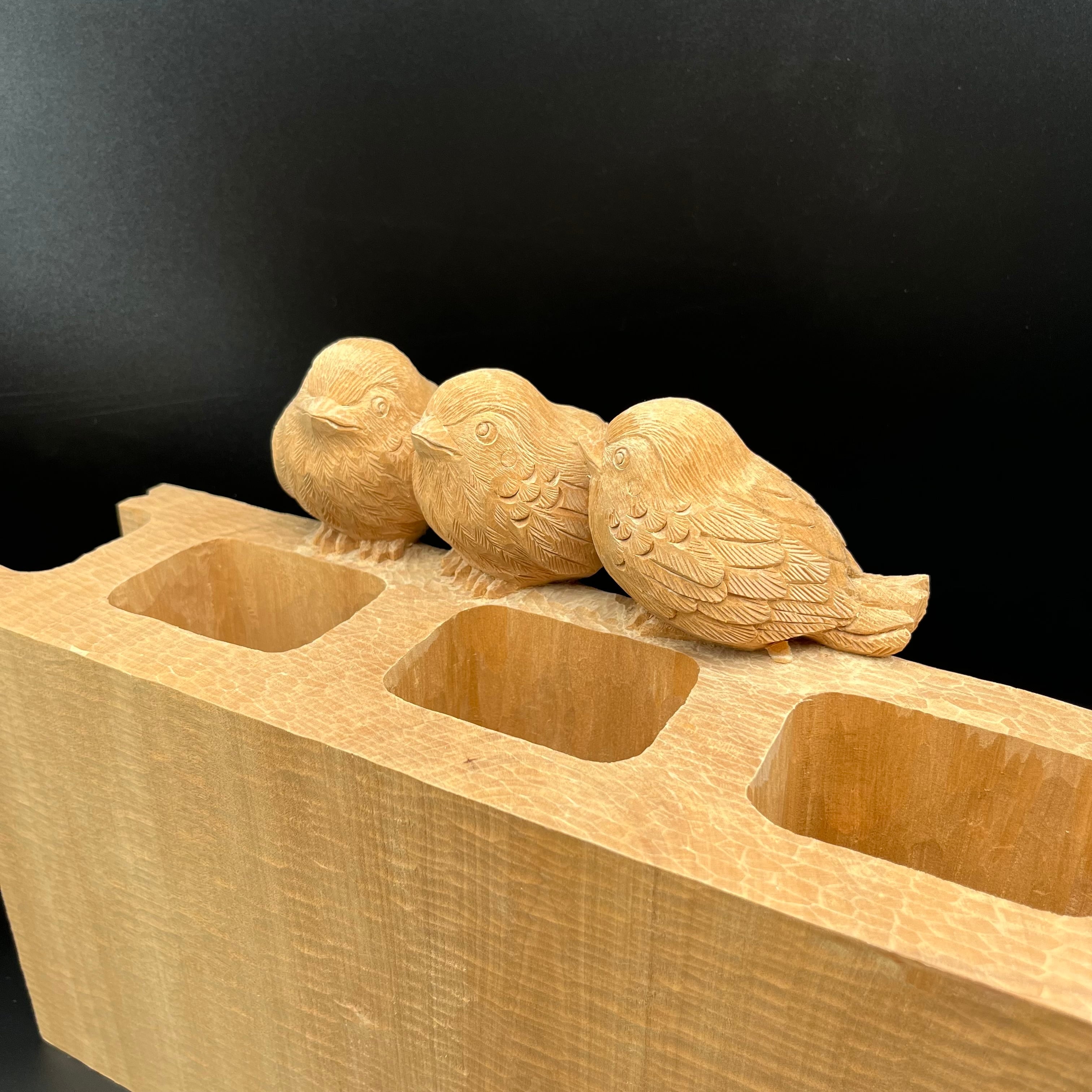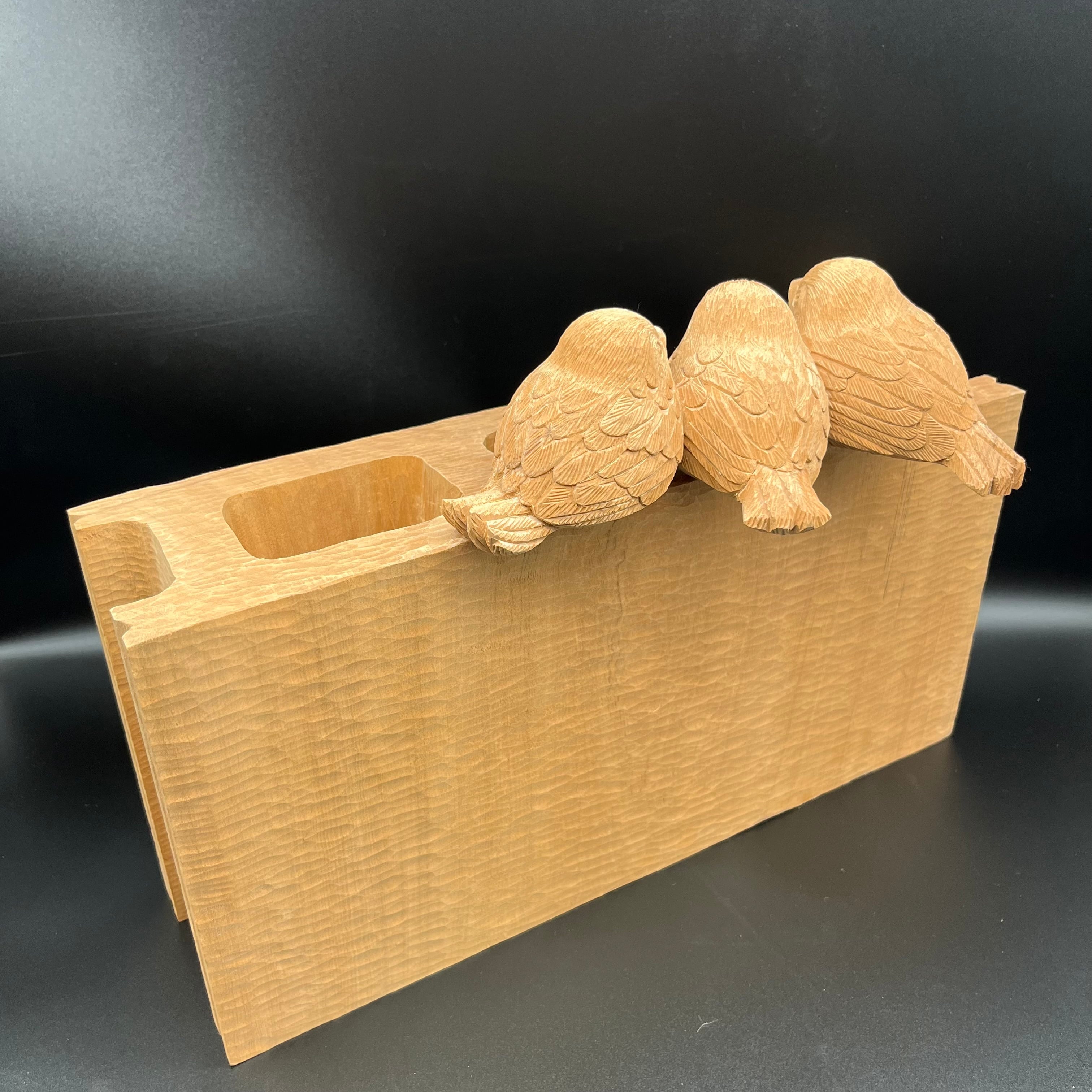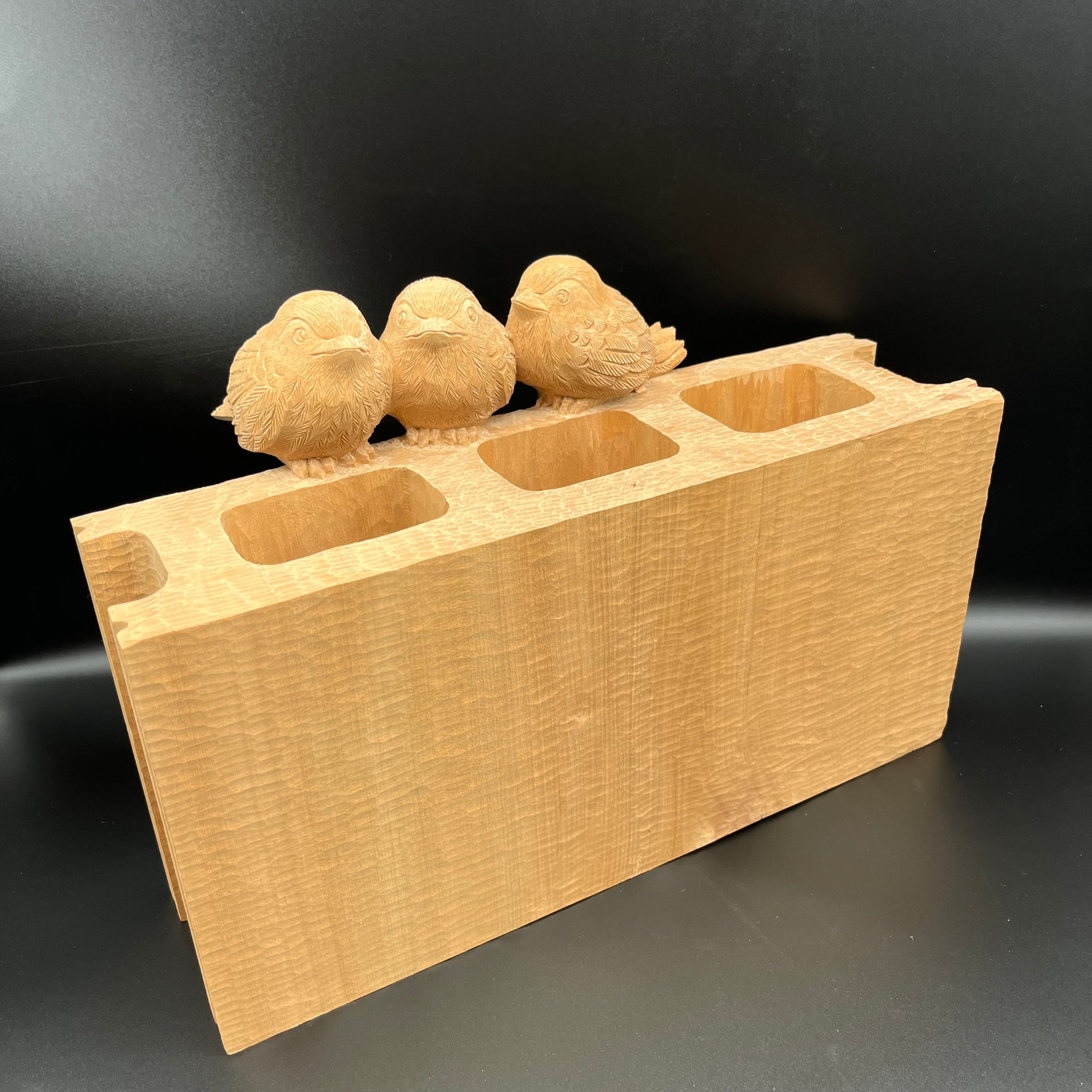 3羽のかわいいスズメがコンクリートブロックにのっています。 何か相談しているような愛くるしいデザインです。 すべて一木 無垢仕上げ 桂材 サイズ訳30センチ