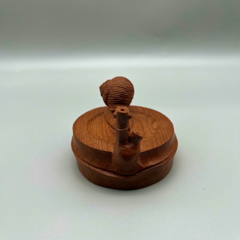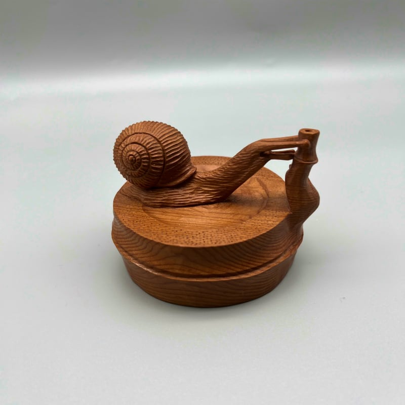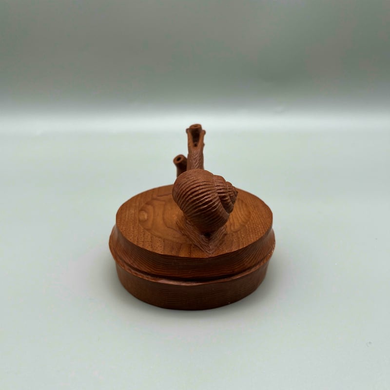 サイズ 8×8×6(縦横高さ)㎝ 一位材 竹とかたつむりを一木にて彫ってあります。 角を竹の節の部分に沿うようにデザインし 強度をもたせてあります。 殻の柄は繊細で一位の木目の美しさを際立たせています。